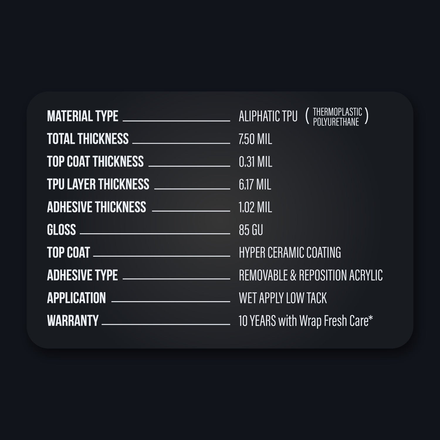 ARMR PPF warrants the product to be free of manufacturer defects, bubbling, cracking, delamination and discoloration for up to 10 years from the date of purchase when exclusively and regularly maintained with Wrap Fresh care products and used as directed in addition to the qualifications for the Limited Warranty have been met. This warranty does not cover damage caused by normal wear and tear, road debris, improper use, improper care, improper installation, or any other exclusions listed below. This warranty is non-transferable, and is only valid to the original purchaser.