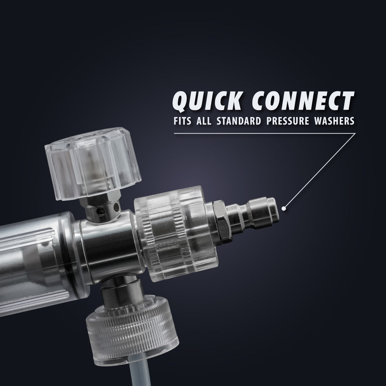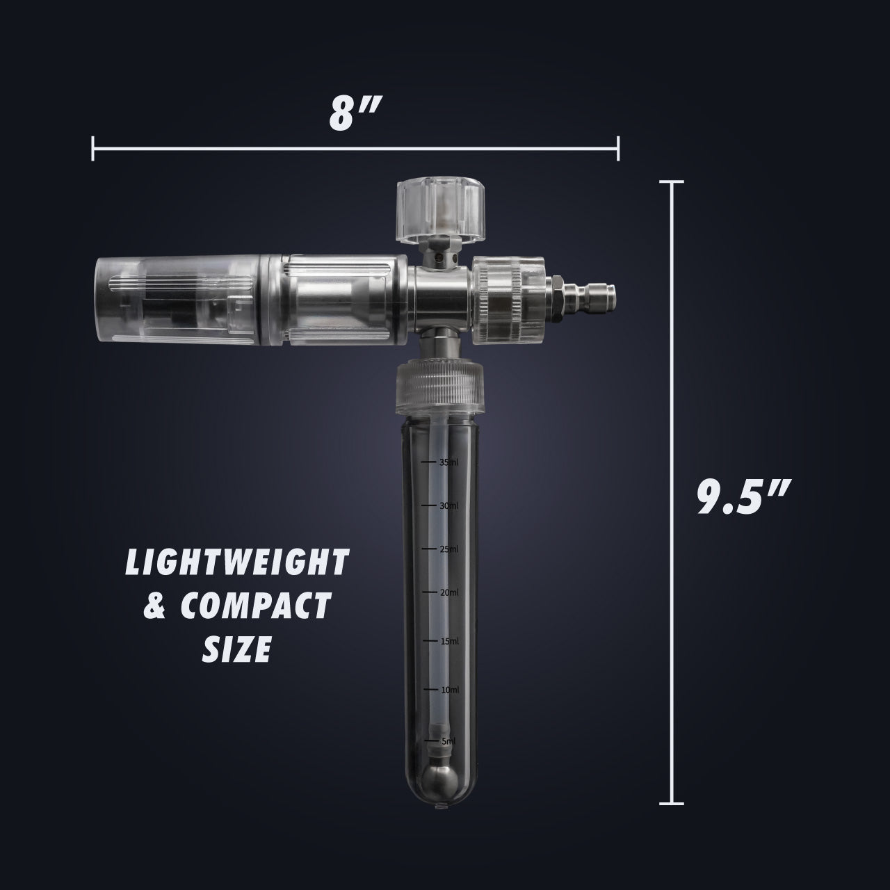 Our Mini Foam Cannon is designed to be a compact and lightweight solution to the oversized and heavy cannons on the market that are cumbersome and leave your wrist exhausted after washing your car. The canister is easily removable and refillable so that you can quickly foam, rinse, and repeat. Our quick connect fitting easily attached and detaches from all standard power washer heads.