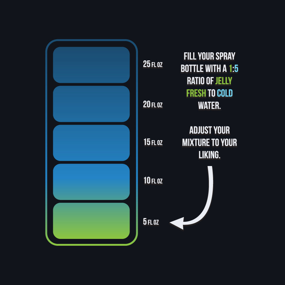 Mix 1 part Jelly Fresh to 5 parts cold water in a spray bottle and adjust the mixture to your liking. For a slipperier solution, add more Jelly Fresh.